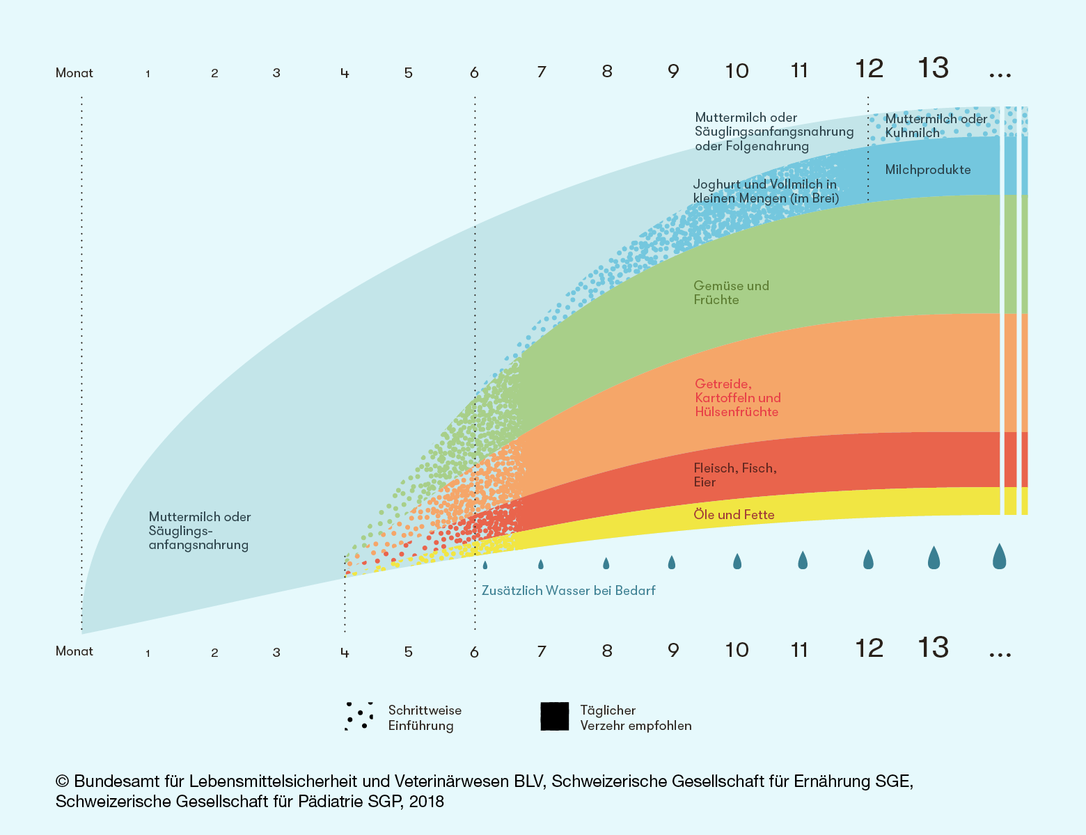 Das Bundesamt für Lebensmittelsicherheit und Veterinärwesen (BLV) empfiehlt ab Beginn des 5. und spätestens ab Beginn des 7. Monats mit Beikost zu beginnen. Ihr Kind sollte so lange weiter gestillt oder mit dem Schoppen ernährt werden, wie Sie und Ihr Kind dies möchten.